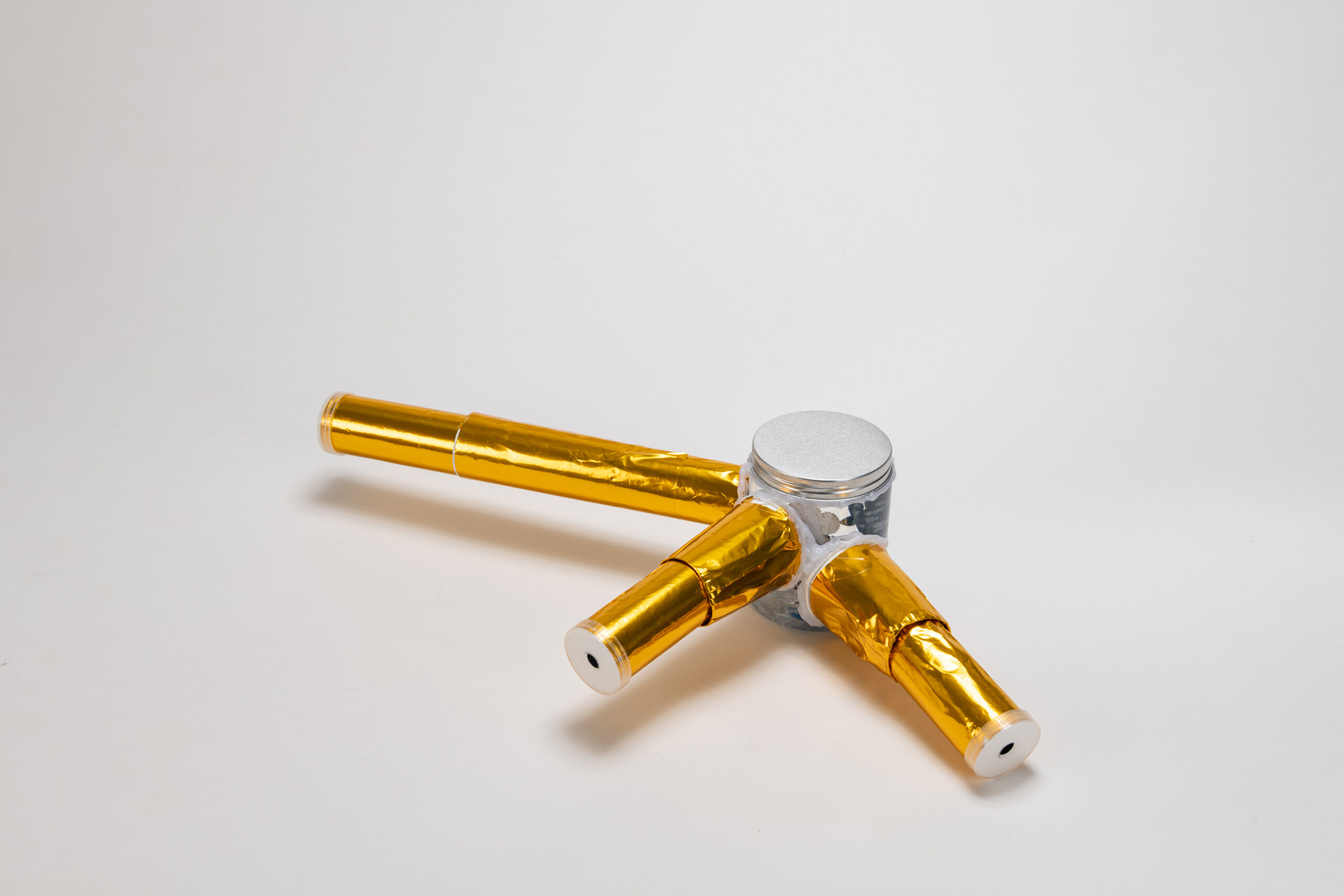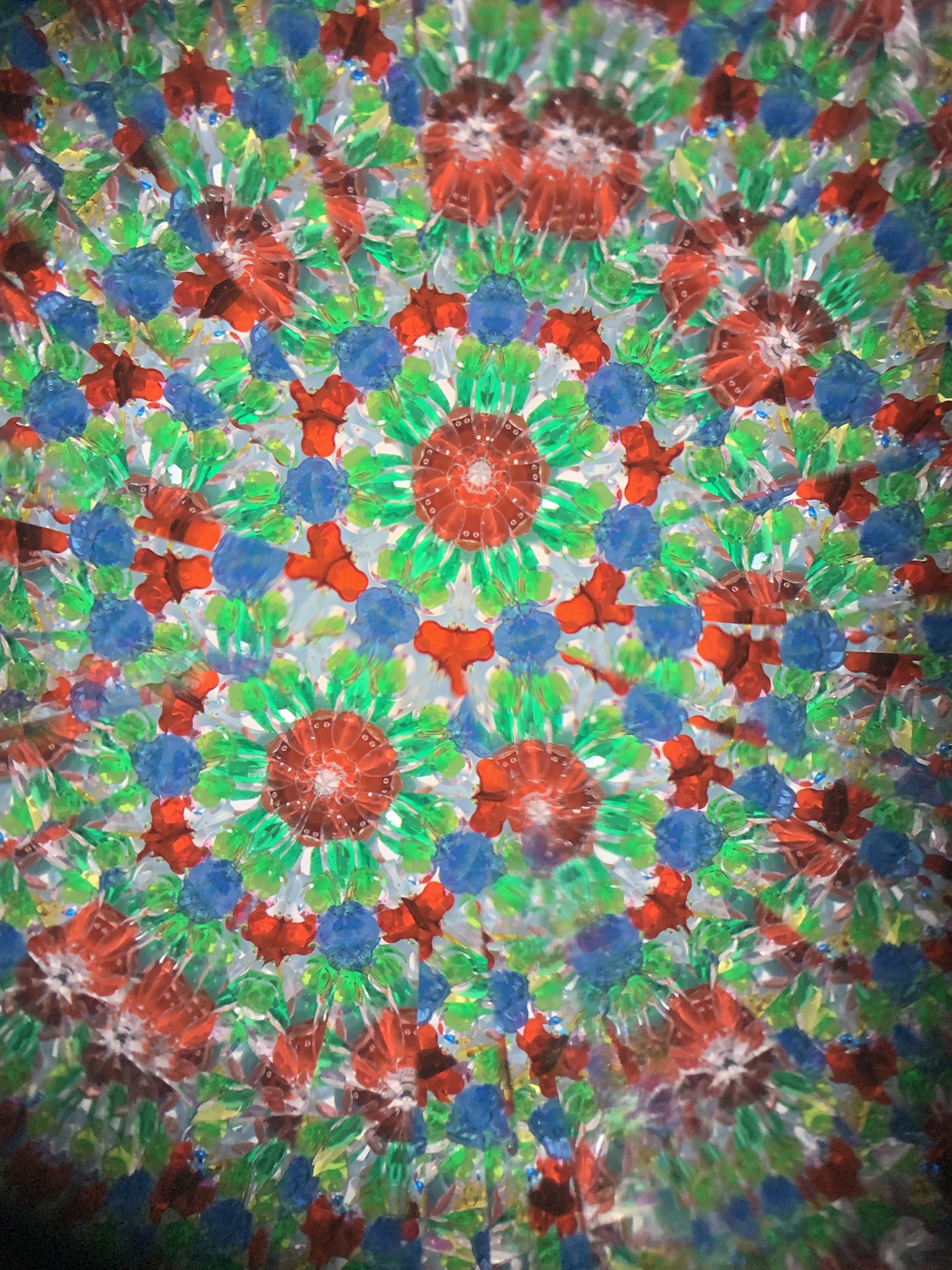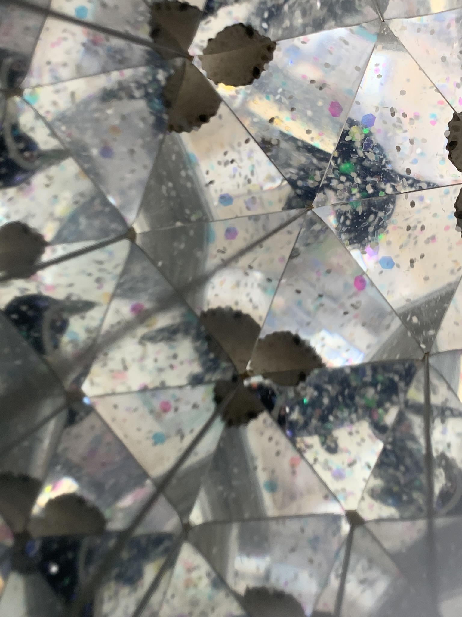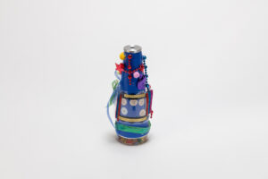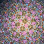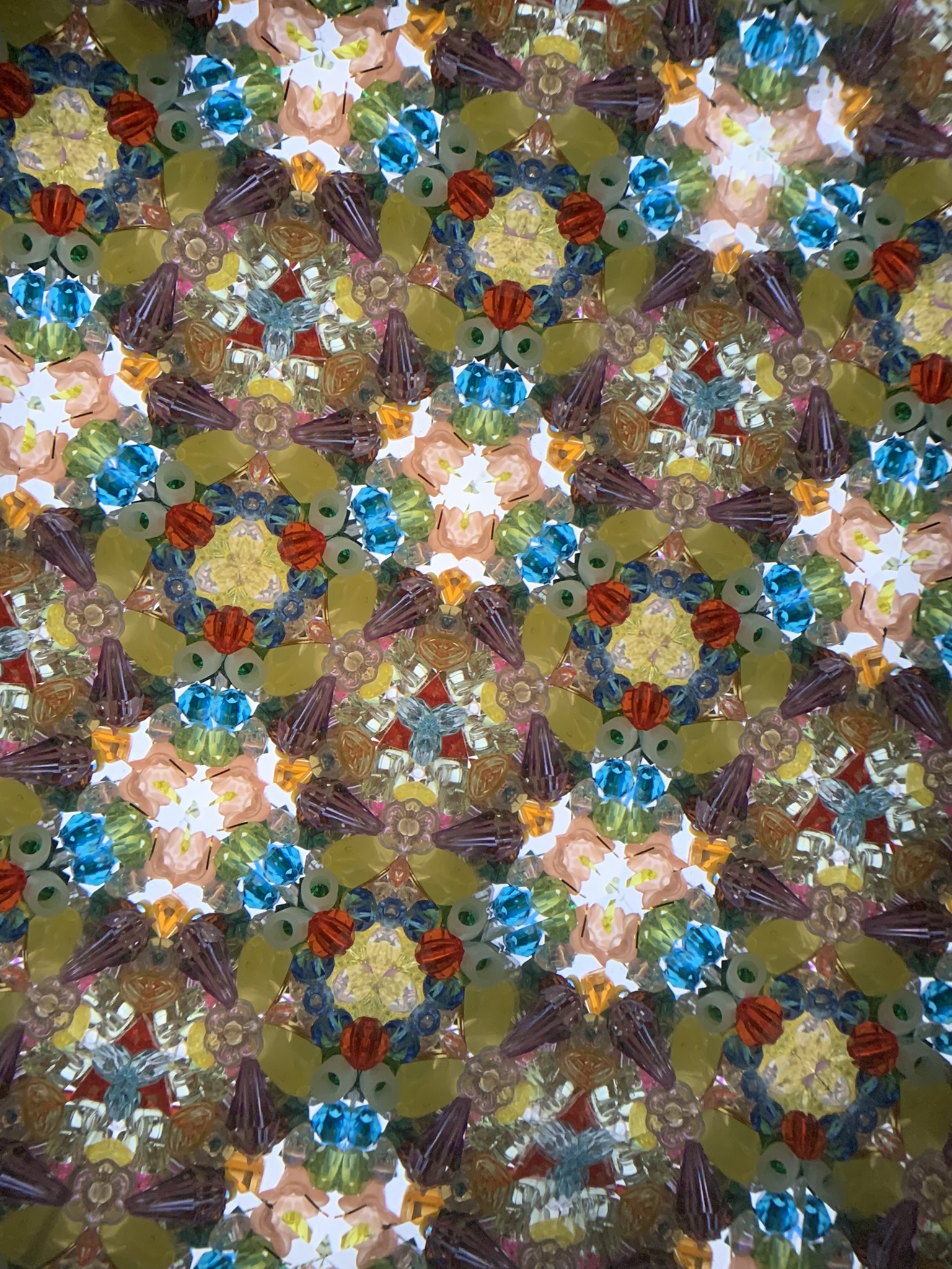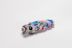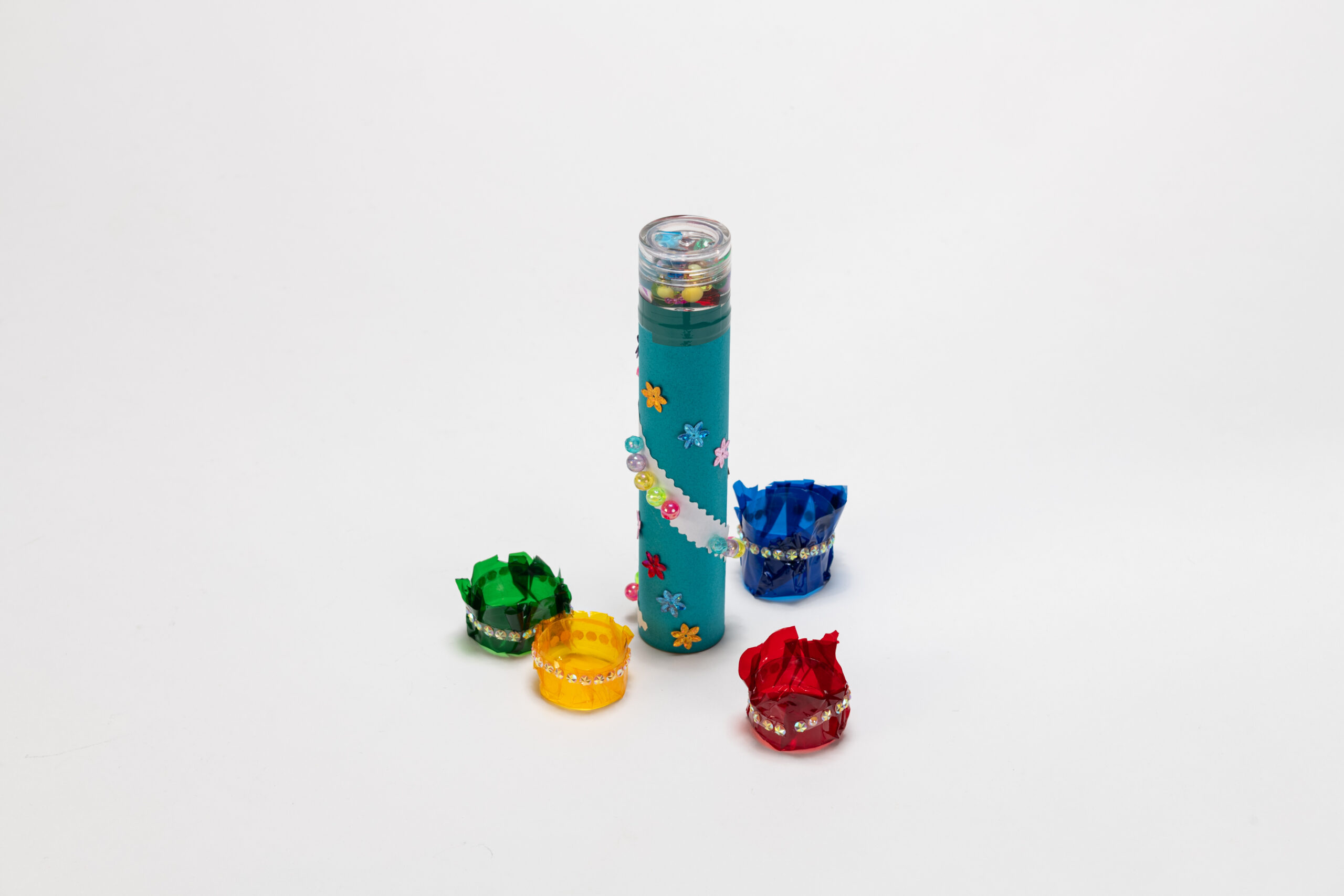 万華鏡の筒は、ふわふわの紐が全体に巻かれており、黄色系統のリボンが2箇所、空色系統のリボンが1箇所表現されています。