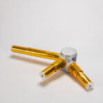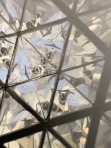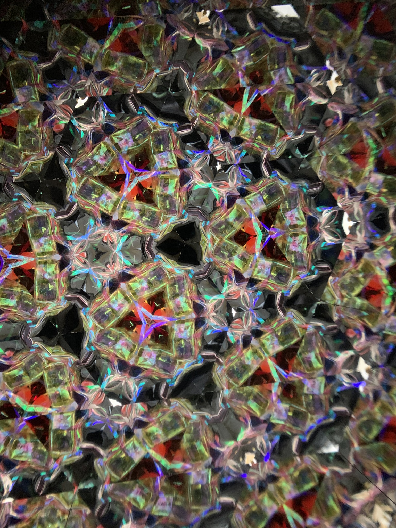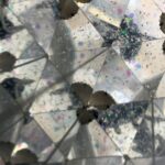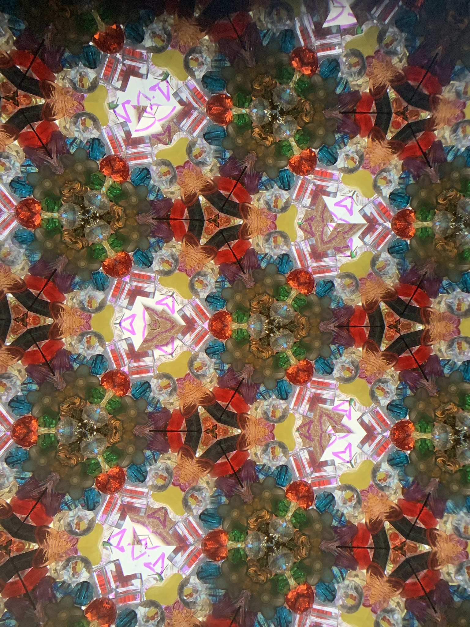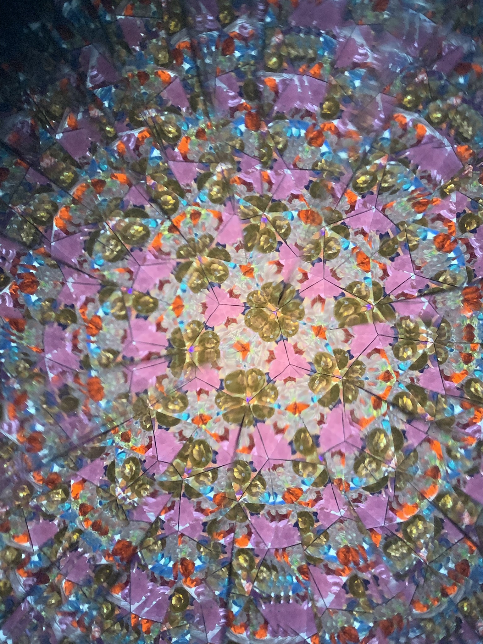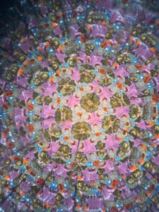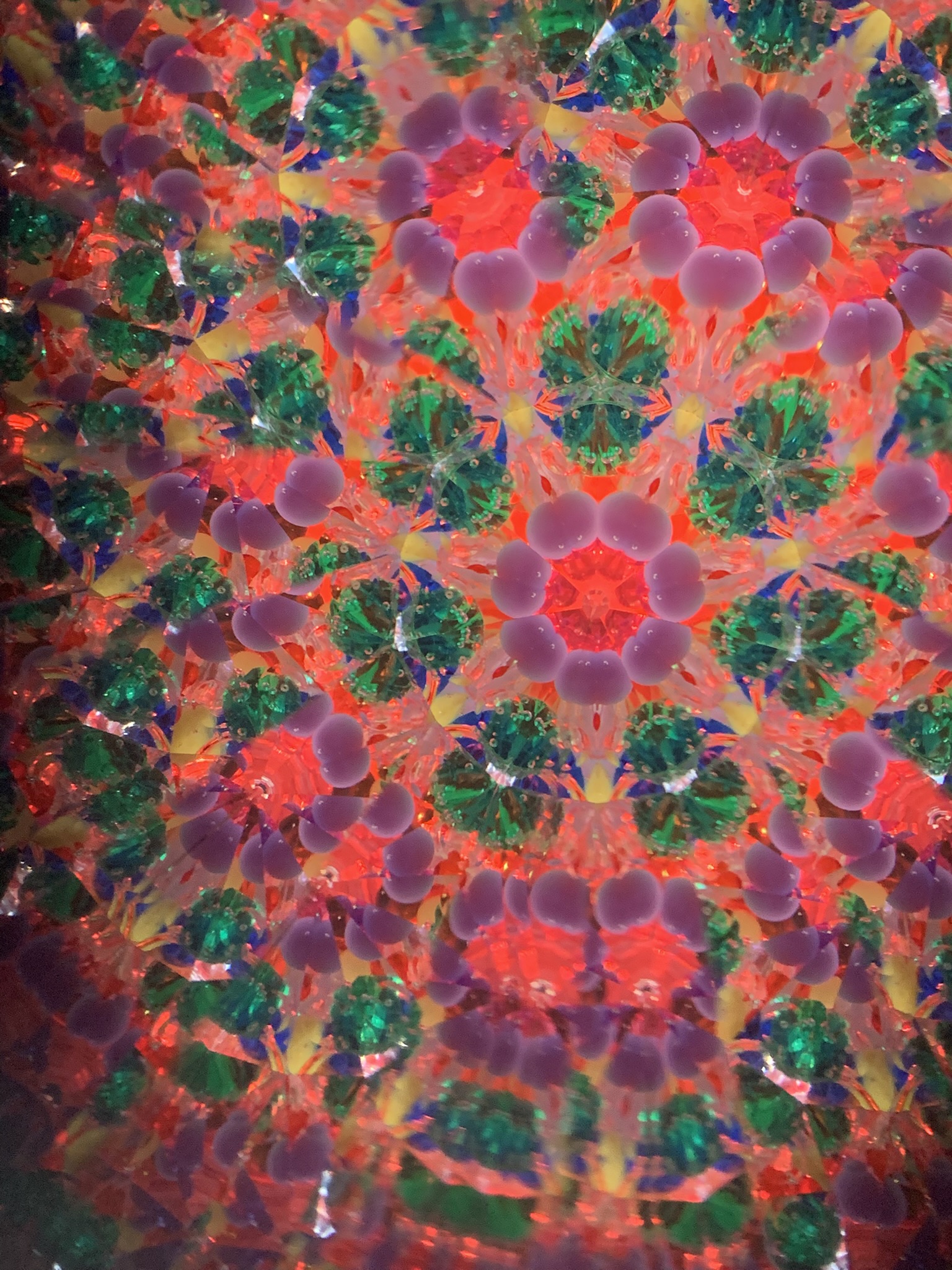 万華鏡の筒は、ふわふわの紐が全体に巻かれており、黄色系統のリボンが2箇所、空色系統のリボンが1箇所表現されています。