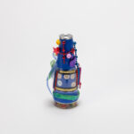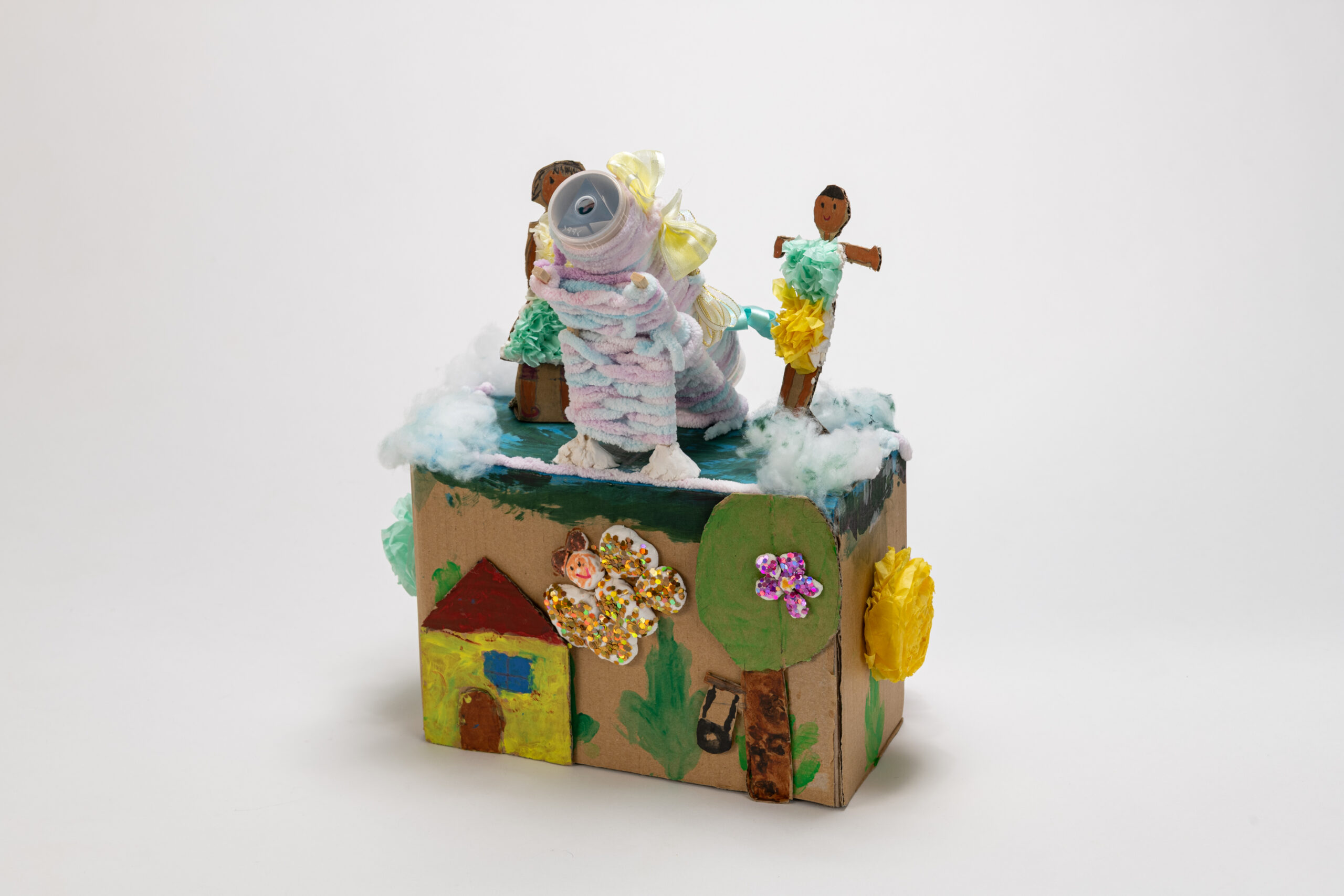 箱の正面には、右側に緑の葉の大木が表現されており、マゼンタ色の花が咲いているようです。木の枝を使ってブランコでしょうか。遊びの雰囲気が感じられます。真ん中には、金色のラメを使った笑顔の蝶々が飛んでいます。左側には、開くことのできる黄土色の扉があり、屋根が茶色で家の色が黄色、窓が青色の家があります。本作品の造形は、とてもユニークで、このようにつくってみようという独自な発想と意欲に溢れています。