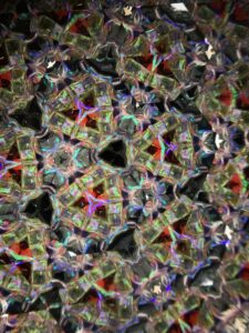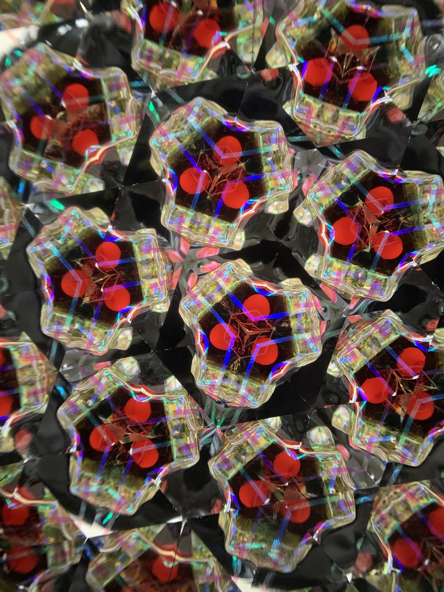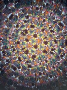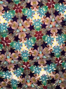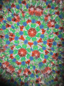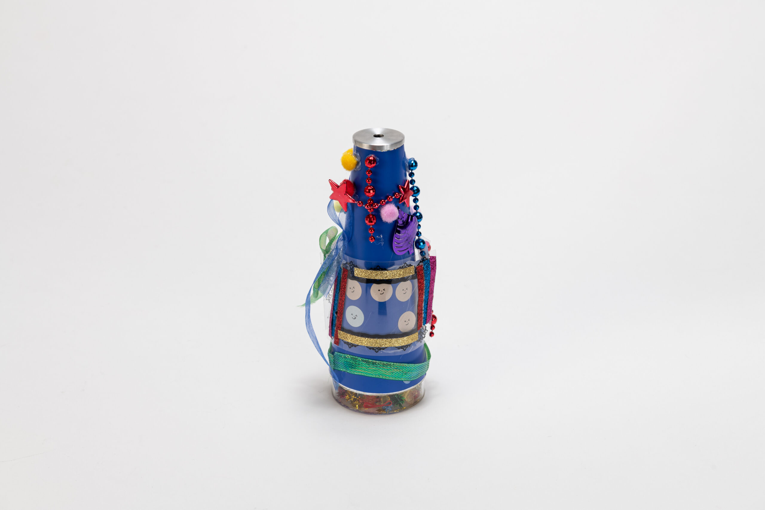 作品名「フラワー」を小学生低学年部門の佳作としました。万華鏡が置かれている箱を主材料としたイメージづくりに特徴があります。この箱の左右や裏面には、紙でできた花たちがぎっしりです。左側にはふわふわな紙を使った薄い空色の大きな花が咲いています。右側には、同じ形状のレモンイエロー色の花が咲いています。箱の裏面には、4色の花がぎっしりと咲いています。ふわふわなフラワーの世界なのです。