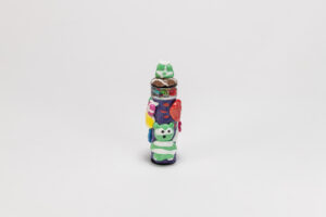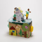 この箱の上面には、ふわふわの紙の服を着ている2人の人が立っています。左側の人は、手を下ろしスカートをはき、おさげ髪をして笑顔いっぱいです。ふわふわの服は、シャツでしょうか。淡い黄色の紙で作っています。スカートは空色です。右側の子どもは、両手を横に挙げ、空色の服を上半身に着て、黄色の服(パンツか短いスカート)をはいています。頭はショートヘアーで、つぶらなかわいい目をしており、小さく微笑んでいます。女の子や男の子の洋服も両サイドのお花と同様のお花畑にしたかったそうです。箱の上面は青く塗られ、両わきは白い綿でふわふわな様子が表現されています。空の連想でしょうか。海の連想でしょうか。ふわふわしたイメージが広がる世界となっています。