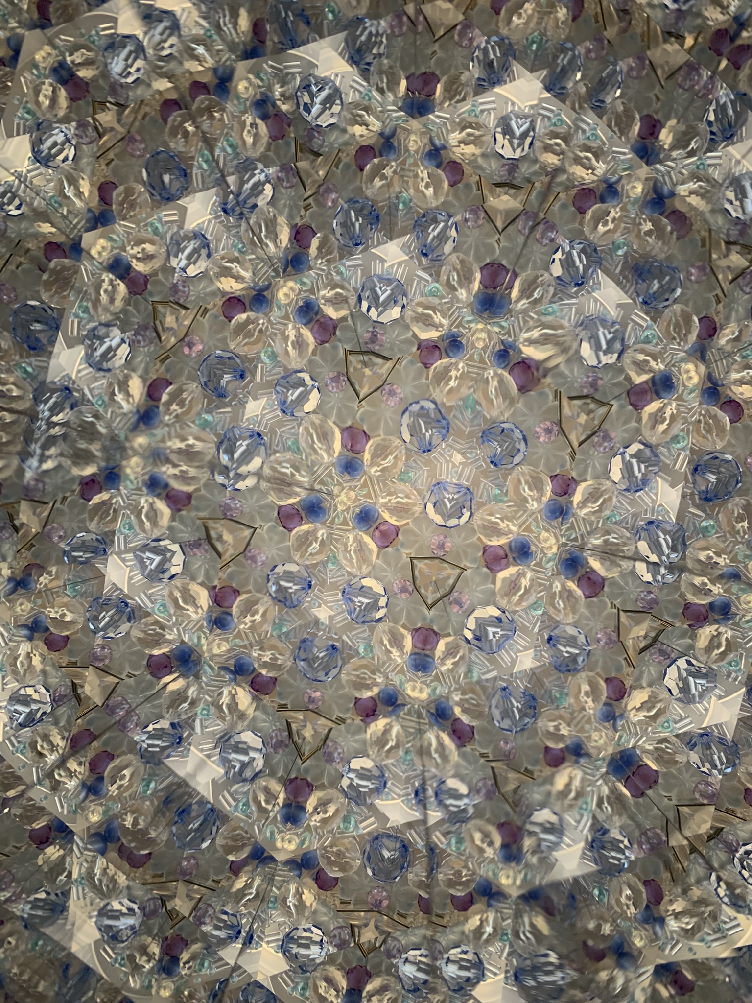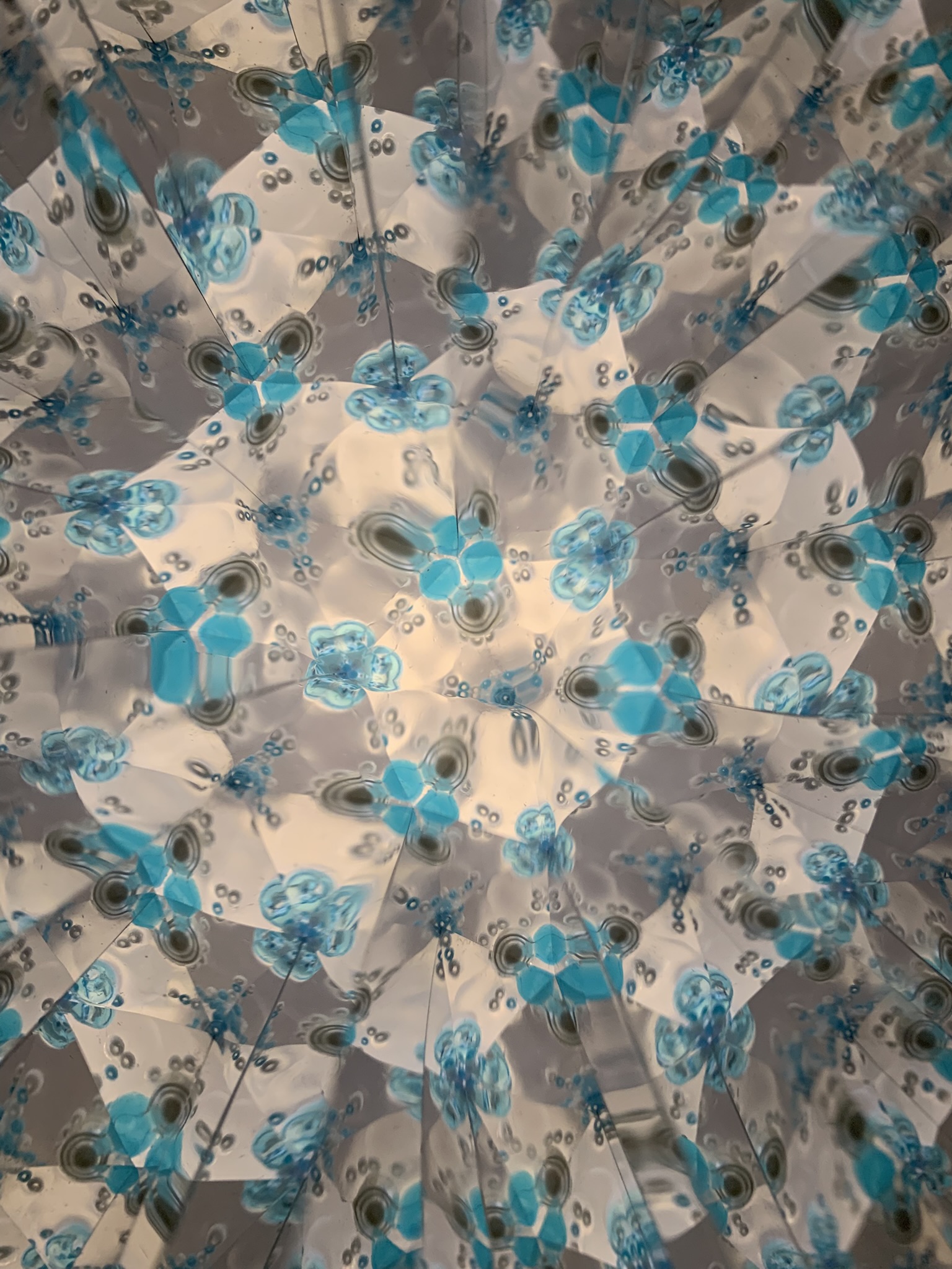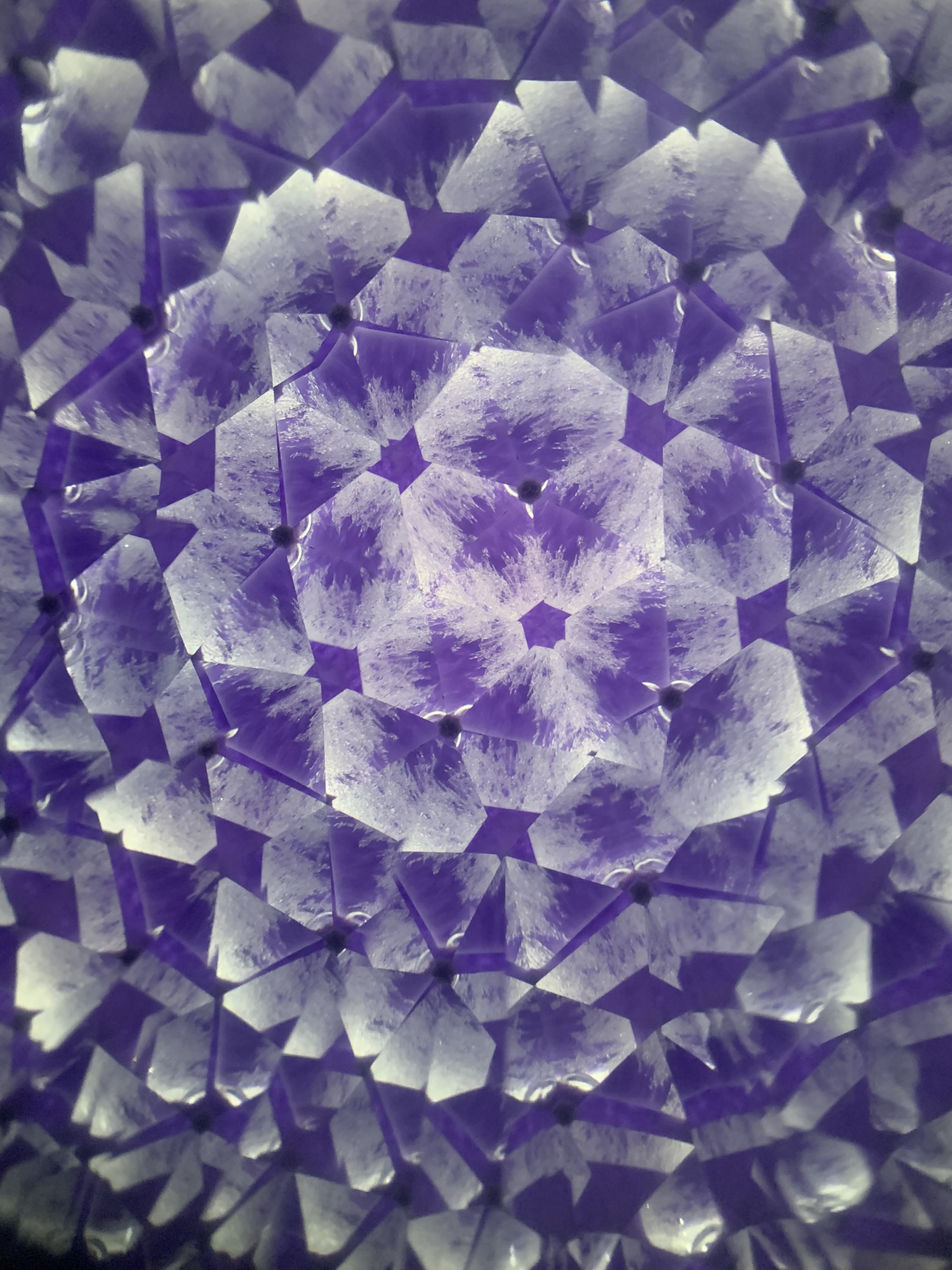 筒全体は、白いフェルトのような柔らかな材料で表現されています。万華鏡のシステムは、オブジェクトが入っている密閉された棒(ワンド)の中の流れ等を見る万華鏡です。筒と棒で構成されているのですが、本作品にはその容器に白い結晶が入っており筒と類似した白なのです。全体としては、接合部が紫をしたT字型に見える作品です。筒の外観には結晶形が配置され、万華鏡内の光イメージを予感させるデザインです。