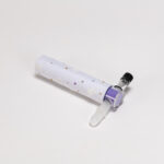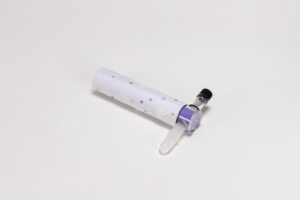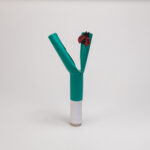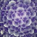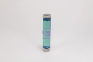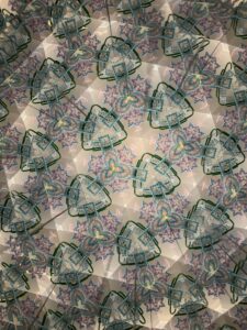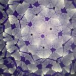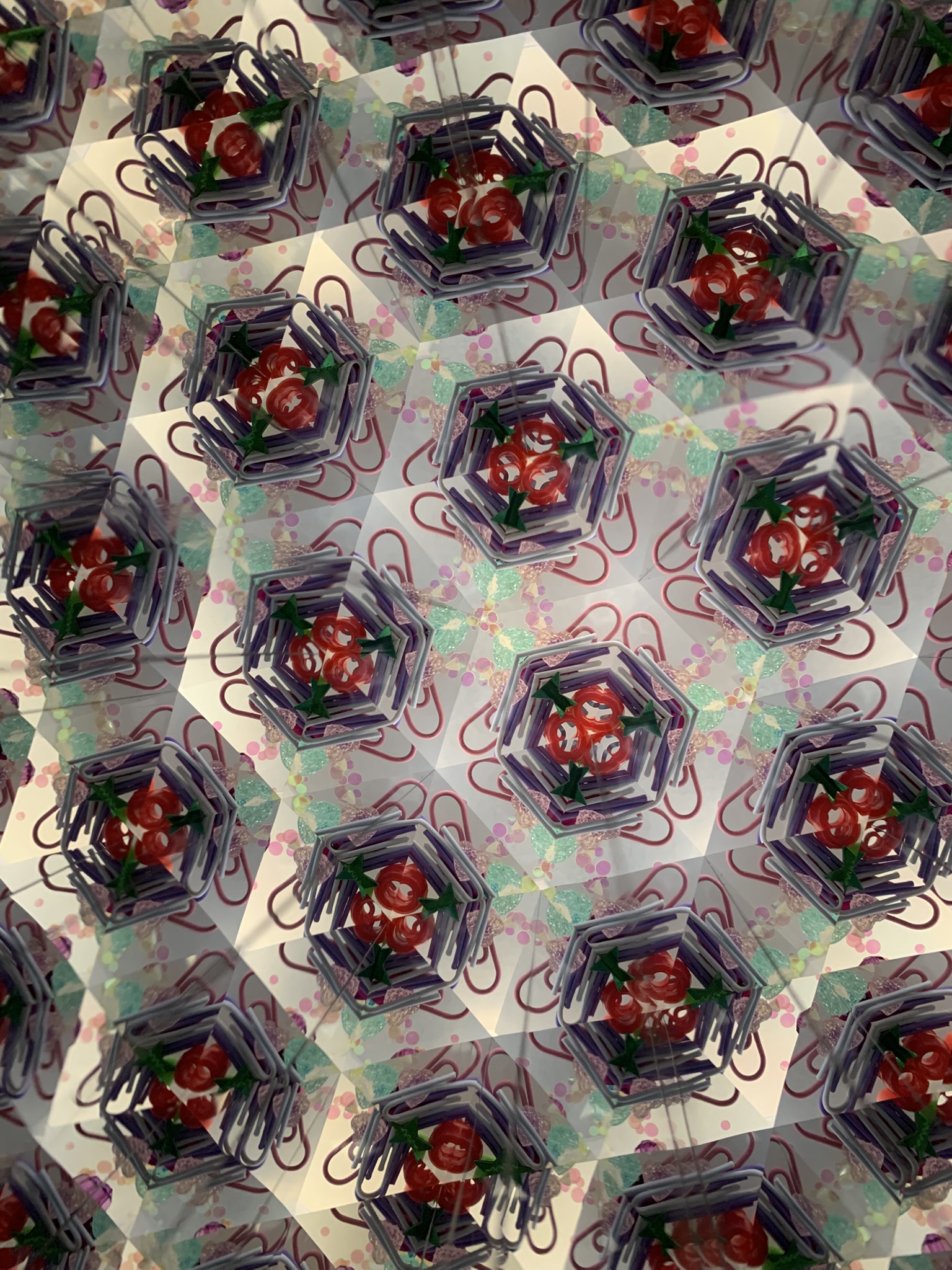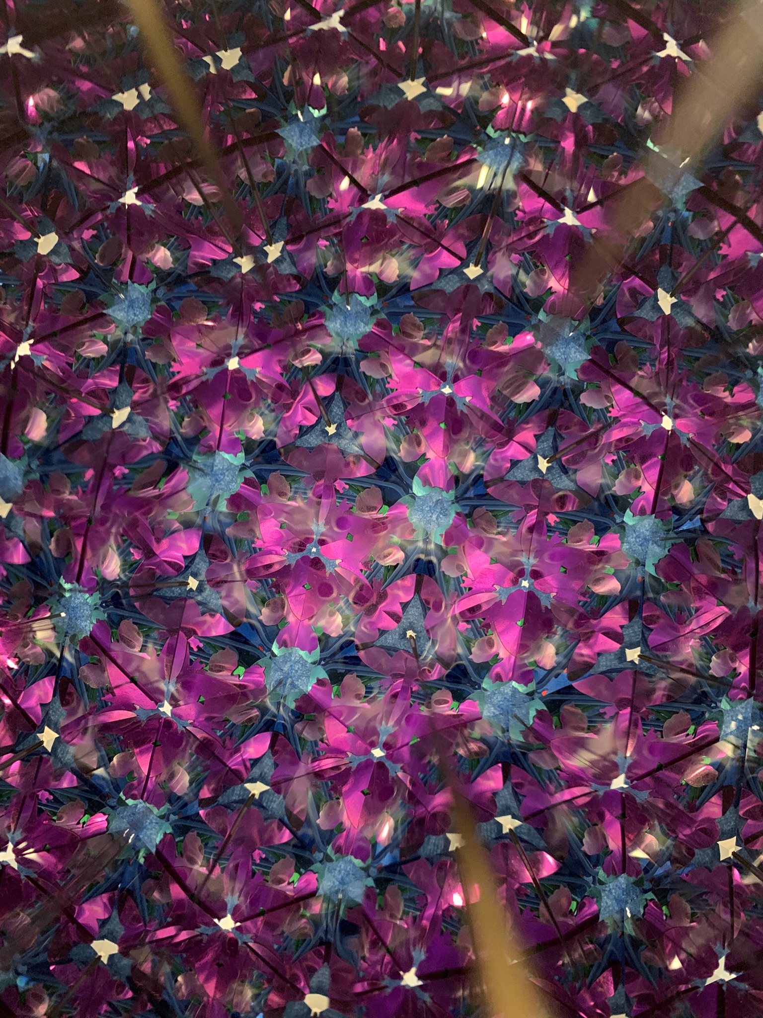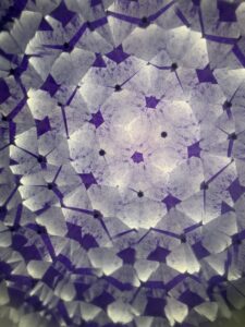 筒全体は、白いフェルトのような柔らかな材料で表現されています。万華鏡のシステムは、オブジェクトが入っている密閉された棒(ワンド)の中の流れ等を見る万華鏡です。筒と棒で構成されているのですが、本作品にはその容器に白い結晶が入っており筒と類似した白なのです。全体としては、接合部が紫をしたT字型に見える作品です。筒の外観には結晶形が配置され、万華鏡内の光イメージを予感させるデザインです。