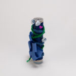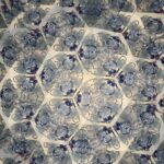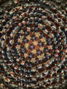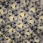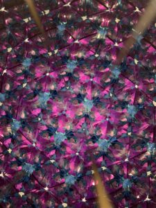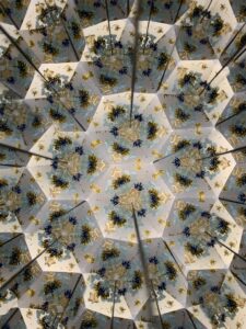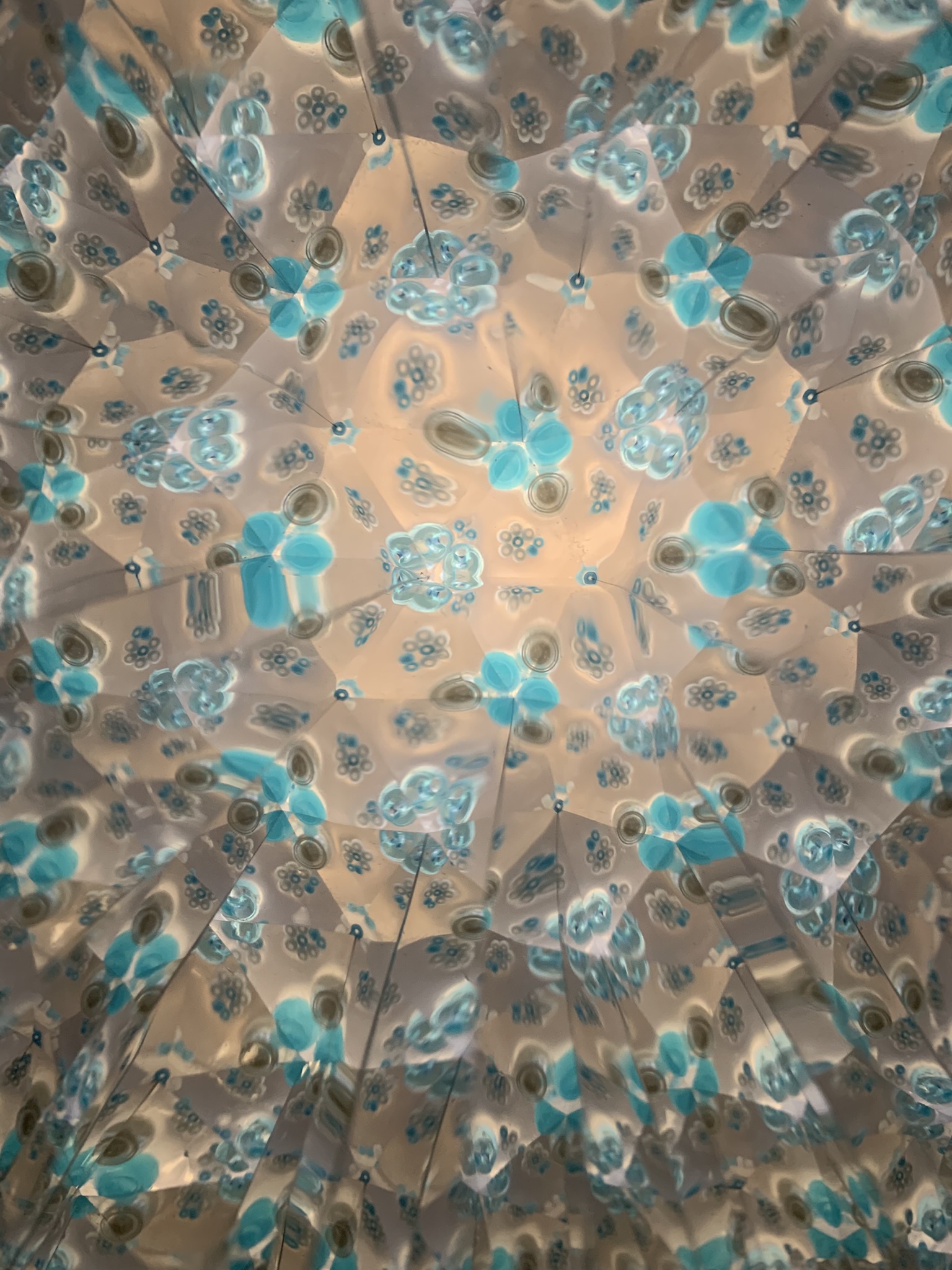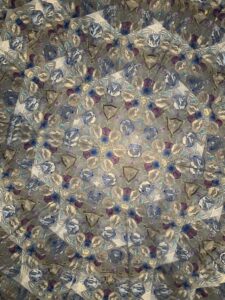 紺色と青色の2色の毛糸が万華鏡の周りを空間的におおっている、他にない貴重な万華鏡です。手の中に、アートの総力を挙げたパビリオンがあるかのような造形なのです。万華鏡が、建築世界にワープしてしまったような壮大感がある作品ということができます。
