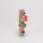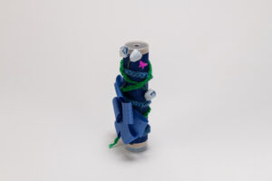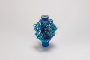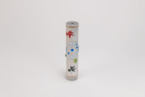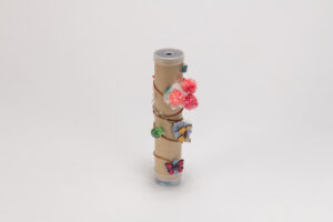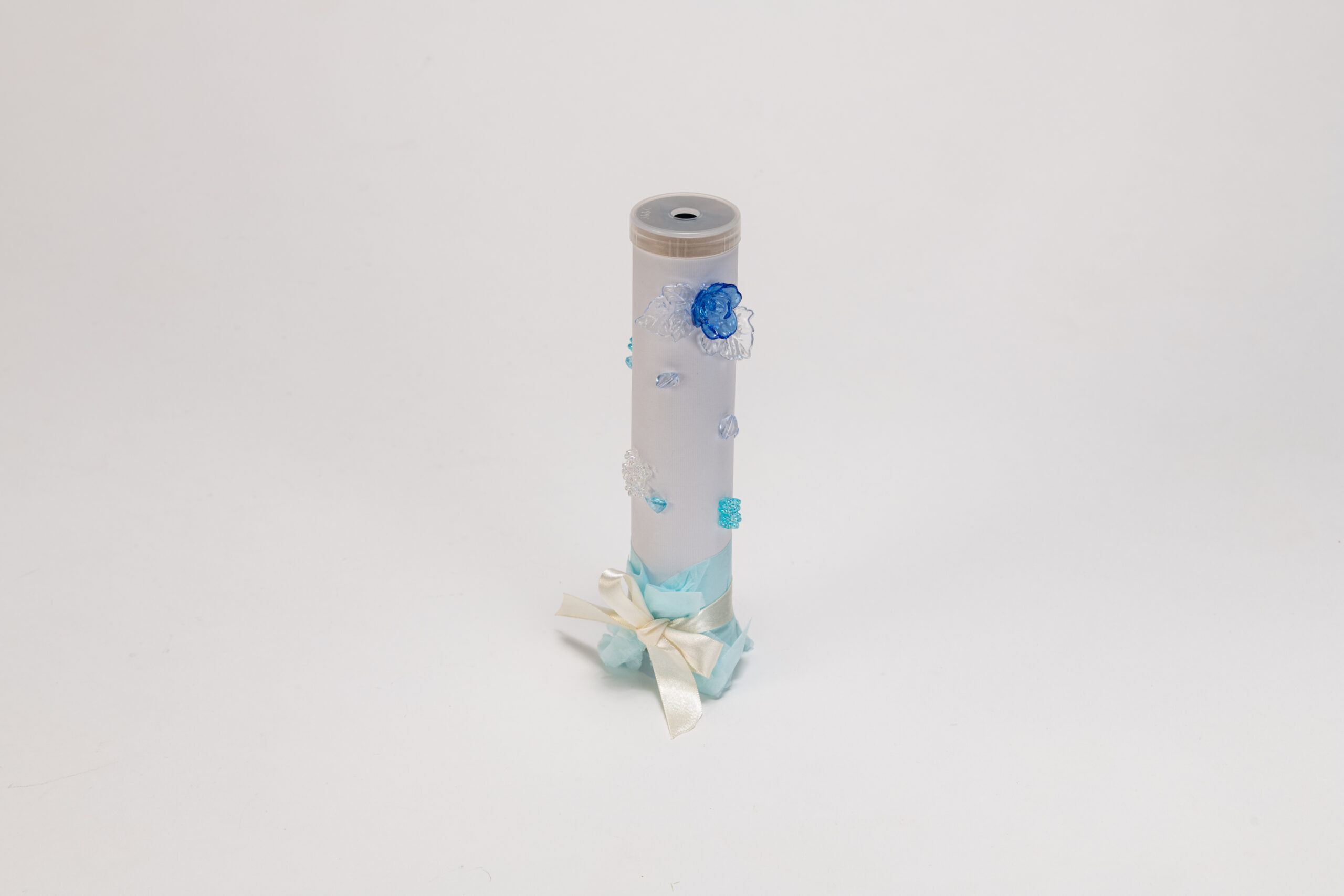 作品名「青い花のブーケ」を中学生部門の審査員特別賞としました。筒の全体は、ブーケで使われる花をおおう紙の印象でしょうか。筒全体の主調色(ドミナントカラー)を、白色としています。そのため、白色の醸す、清潔感や清楚感があります。オブジェクトもパールのような白色が配置されており、しかも正方形型なのです。同一の中にも主張するこだわりが感じられます。