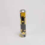 作品名「0時の町並み」を中学生部門の京都万華鏡ミュージアム賞としました。この万華鏡は、外観が黄色と紺色のコントラストの高いデザインで構成された、とても目立つ美しい万華鏡です。