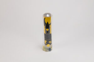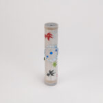2つの大きな特徴があります。1つ目は、つくりの2重構造です。外側の透明ケースと、絵がデザインされ鏡が設置されている内側の円柱状ケースで構成されているのです。外側のケースは単なるケースではなく、最下部に5個の黄色のビー玉と、紺色の2個のビー玉を入れ、このビー玉の色や動きが、内部の円柱型の万華鏡の光の取り入れ口と連動しています。オブジェクトケースになっているのです。さらに窓ガラスのように光沢感があるので、町並みをある建物の窓から見ているような気持ちにさせてくれます。