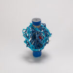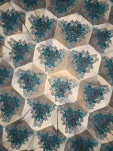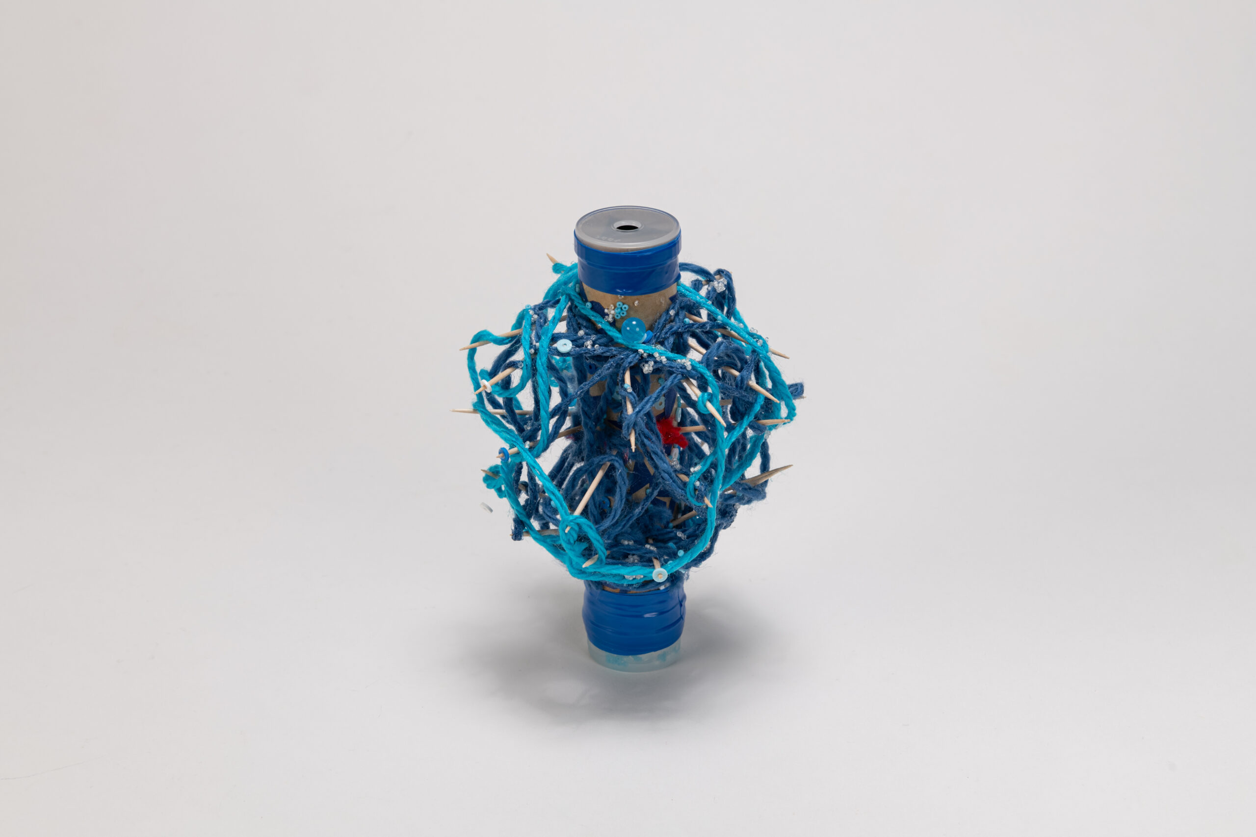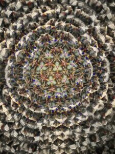 この空間構造は、つまようじを筒に沢山刺すことで実現されています。これを支柱として毛糸を巻いていって、みごとな高いボリューム感を実現しました。うねった波を再現したそうです。そこにビーズや赤い毛糸をつけることで、水中のサンゴや貝殻が想像できます。赤い毛糸は、筒に貼られており、海面と海底の関係でしょうか。とても空間を感じさせます。
