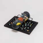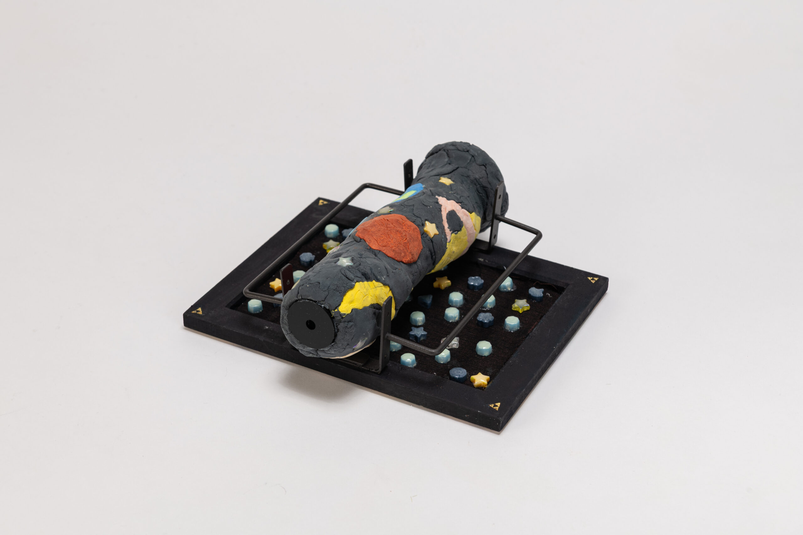 粘土で筒全体を宇宙につくっておられます。この万華鏡を木製のフレームに、金属製の支えがついた台を自作されて置けるようにされた作品です。木製のフレームの中心の長方形部分には、空色や紺色の小さな円柱型が沢山貼られていて、その中に星形が混在しており、3個の星だけが黄色になっています。粒立ちがそろっている均等感は、宇宙の壮大感やどこか安心感を感じさせる精度の良さが伝わってくる造形です。この台に、万華鏡を置くことになります。筒には土星や赤い星は火星でしょうか。惑星が大胆につくられています。筒の全体は、黒色に近い暗めの灰色です。宇宙空間の暗さが表現されています。