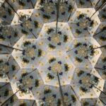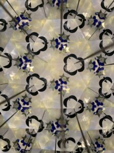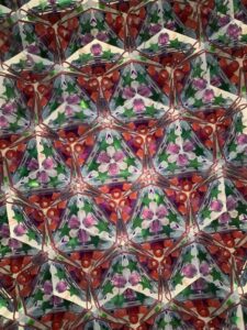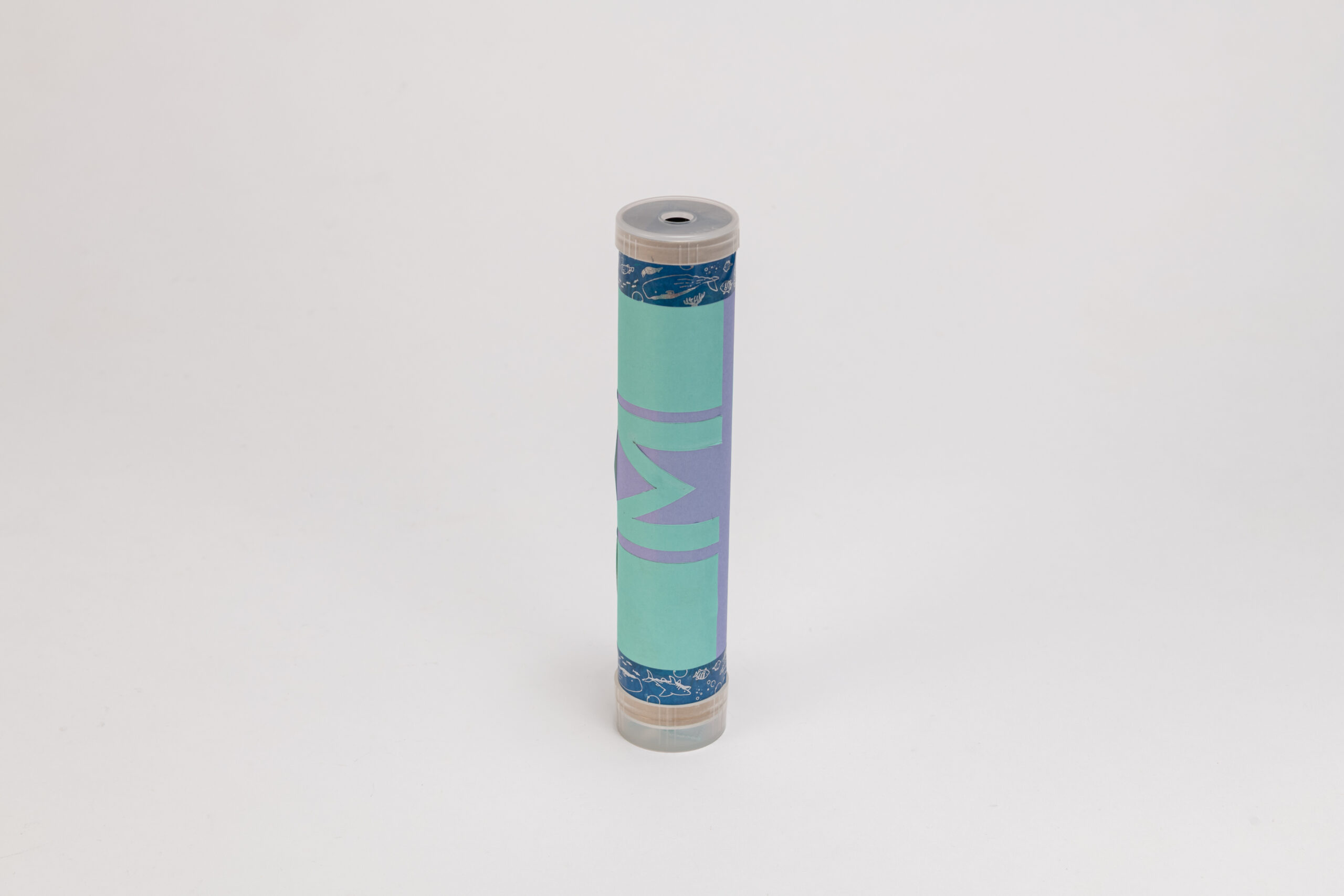 作品名「M」を中学生部門の佳作としました。この作品は、万華鏡の両端にウミガメやサメやクジラや種々の魚たちのいる深い海を連想させる紺色の紙が配置されています。中心部分には、薄紫色を背景に貼り、空色の紙を「M」という文字を切り、前後で透けて見えるようにされています。どこかモダンな感じのする万華鏡といえるでしょう。タイトルのMという文字が、表現されているのですが、Mという文字は何に由来されているのでしょうか。なんだろうとワクワクと想像しながら味わう万華鏡です。モダンな感じという言葉の起源となった、すっきりした線や面の構成で著名な建築デザインのバウハウスデザインを連想する方もおられるかもしれません。