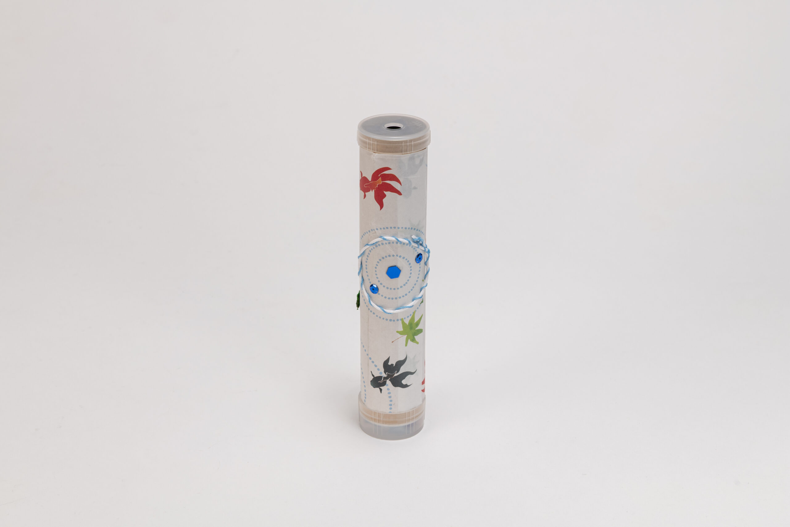 作品名「夏の風物詩」を中学生部門の佳作としました。四ツ尾の金魚のいる紙を活用し、夏の風物詩を表現した万華鏡です。赤い金魚が数匹、黒い金魚もいます。水面にモミジの葉っぱでしょうか。風で様々なものが落ちてくるからでしょうか。水面に波紋が起こっています。