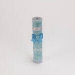 筒には、目立つ紺色の大きなリボンと、薄い青色のチューリップが3本、チェーン状の紺色と緑色の紐で表現されています。マゼンタ色の蝶々も飛んでいます。
