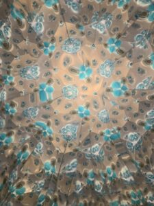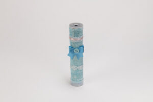 中心より少し高い位置に、背景の空色よりも強い感じの青色のリボンをつけており、リボンの中央で明るい空色のボタンが光っています。青いリボンやレースの表現から、全体的にとても涼しげでかわいらしさを感じる作品です。背景のレースの空色からすると3段階の配色となっています。アクセントとして、白い帯状のレース文様をリボンの上下に配置し、覗き窓側に極めて薄いピンクの細い紐を配置しています。優しい統一感と少しのアクセント。まさしく、エレガントな印象を受ける万華鏡と言えるでしょう。