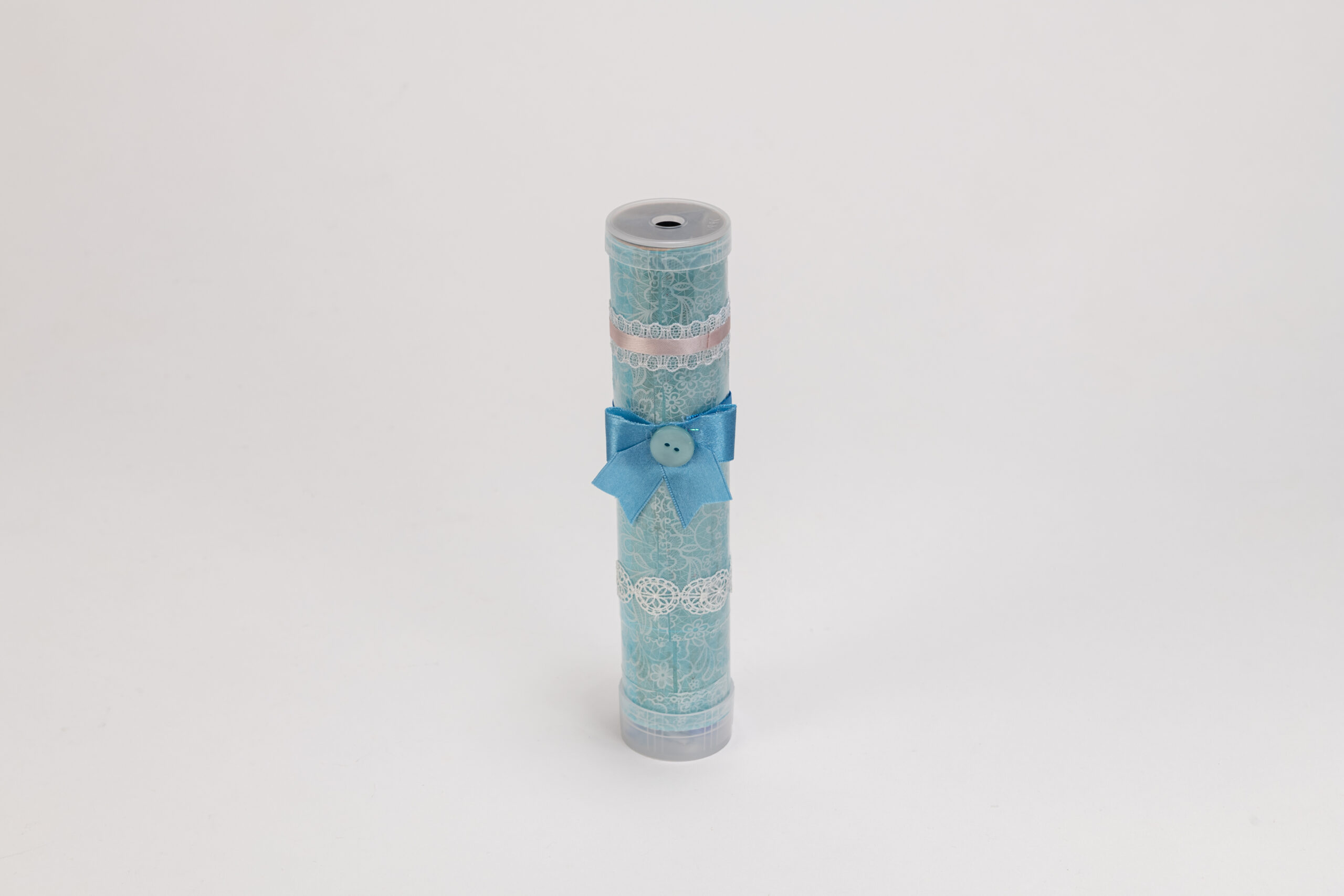 作品名「小さなプレゼント」を中学生部門の佳作としました。美しい空色の万華鏡です。「糸の宝石」と言われるレース状の透かし模様が特徴で、主調色(ドミナントカラー)を空色として筒全面を繊細な模様で構成しています。