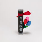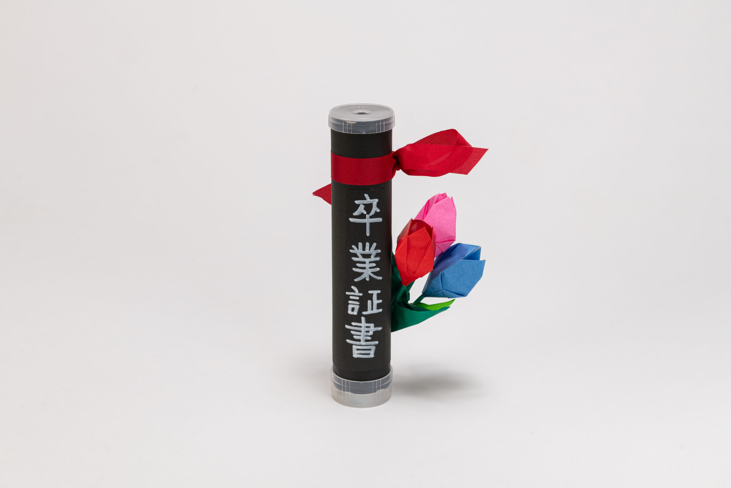 この筒に、折紙で丁寧におられたピンク色・赤色・青色の3本の花束(チューリップでしょうか)が添えられています。卒業式のお祝いの花束なのかもしれません。