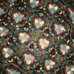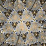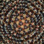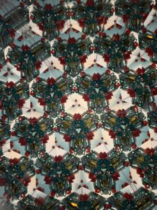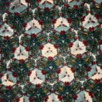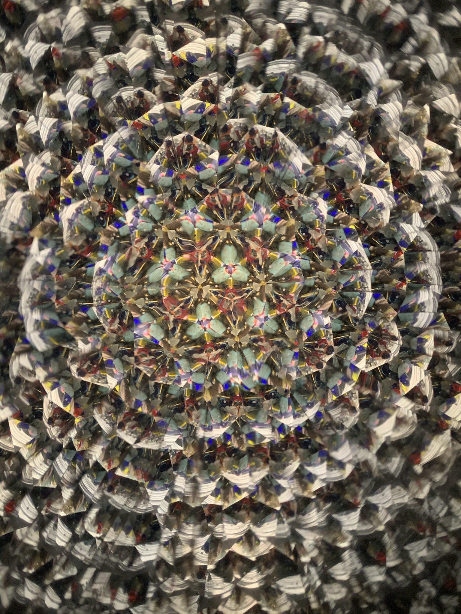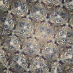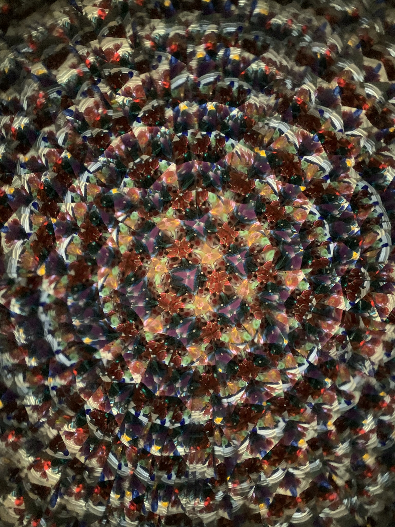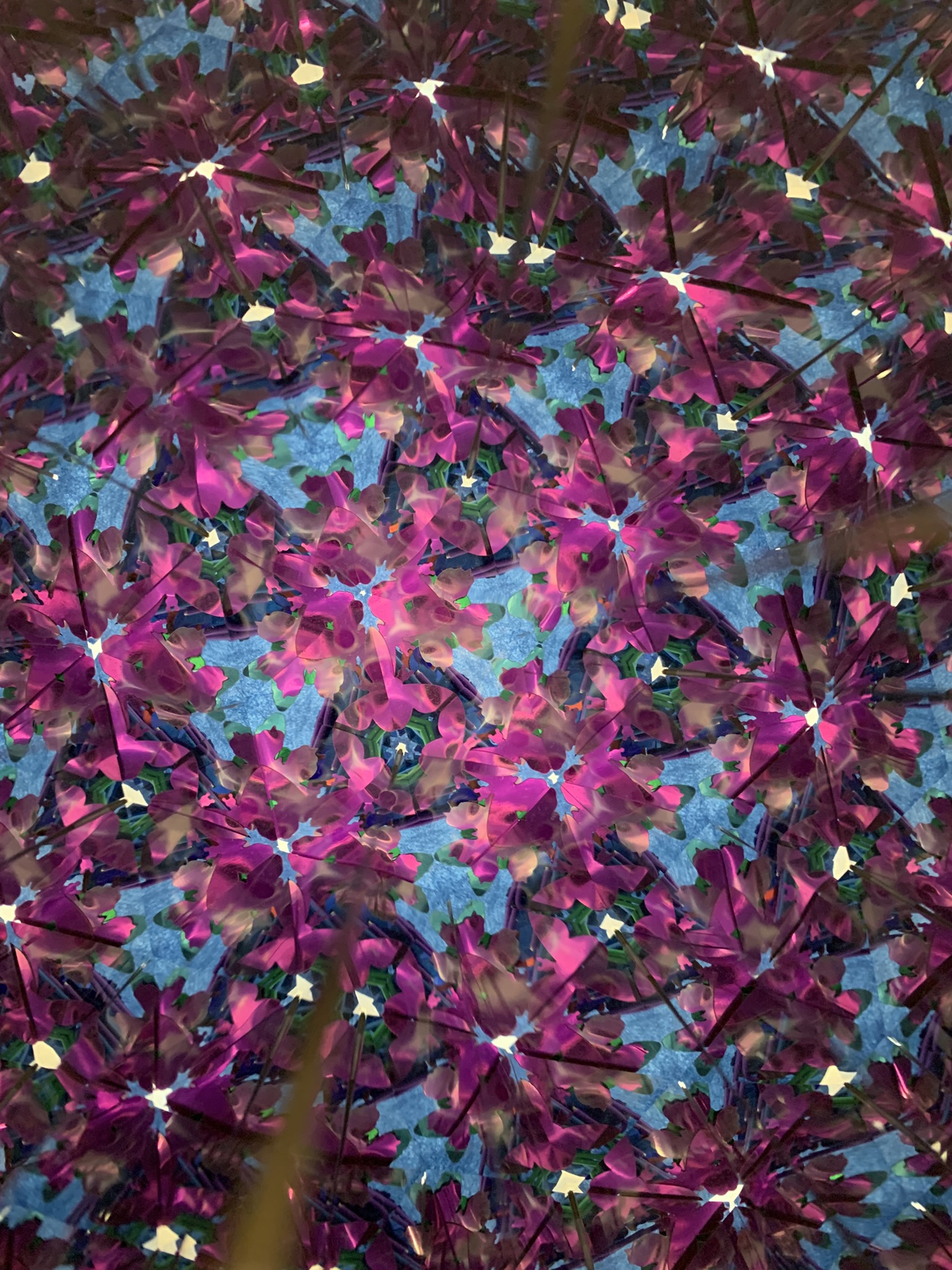 万華鏡システムは、ドライタイプのチェンバースコープと思われます。覗いてみると、金色のモール(シェニール、毛虫のように毛が出ているタイプ)でしょうか。細かくキラキラと美しく輝きます。また、同系色(黄土色)の透明なオブジェクトが入っており、落ち着いた様子で輝いています。この透明なオブジェクトは光のグラデーションをつくり滑らかな印象を与えます。落ち着いた中にキラキラとした様子が見える光イメージになっています。