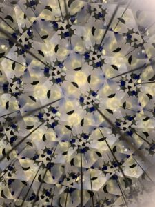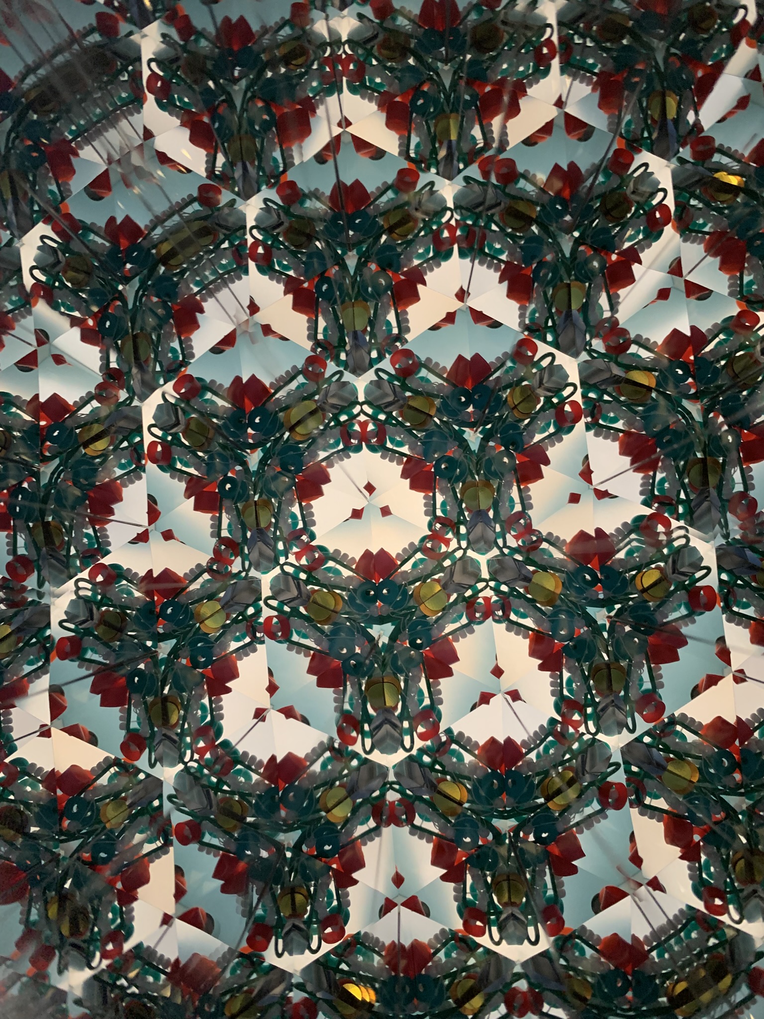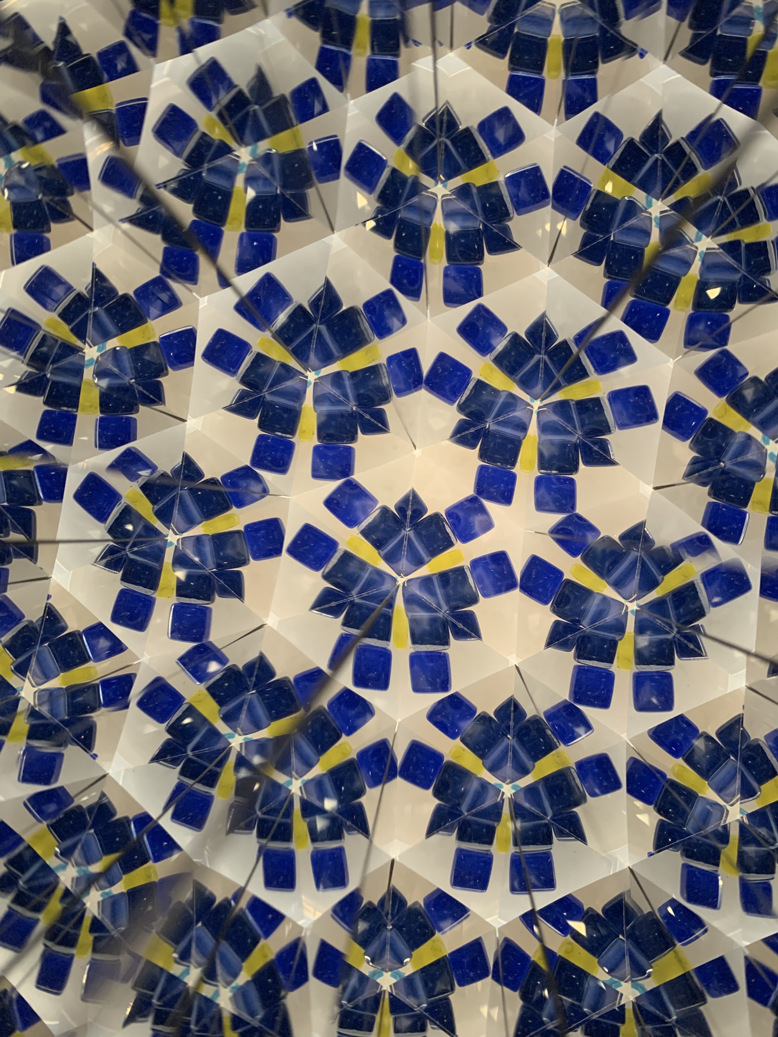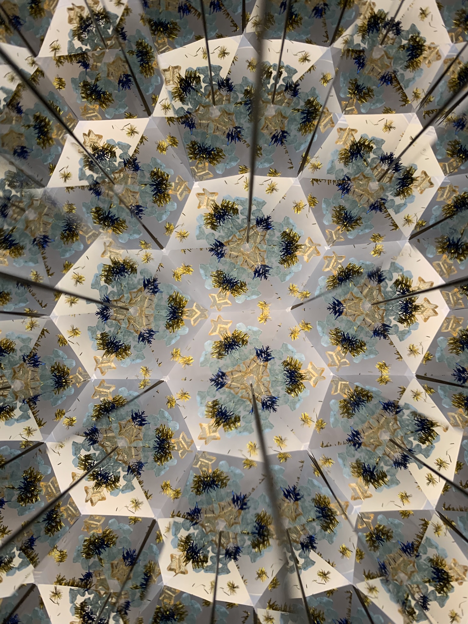 覗いてみると、他にはないしっかりした正方形を基本にした光映像が現れます。透明度の高い黄色や紺色、そして暗めの紺色の作り出す形は、花を上から見たような、驚くほど見事な対称性の世界となって表現されるのです。作者も、花のような形になるようにバランスを考えたとおっしゃっています。そしてこれが毎回、形を変えていくのですから見事としか言いようのない体験をさせてくれます。このように独創的な万華鏡を高く評価して審査員特別賞としました。