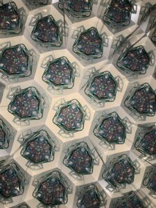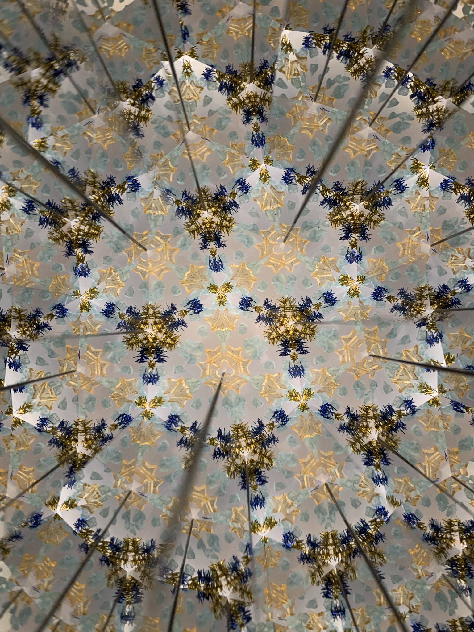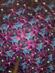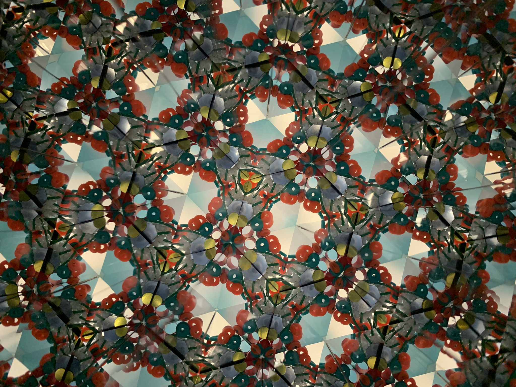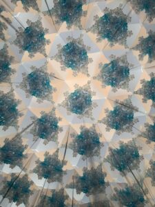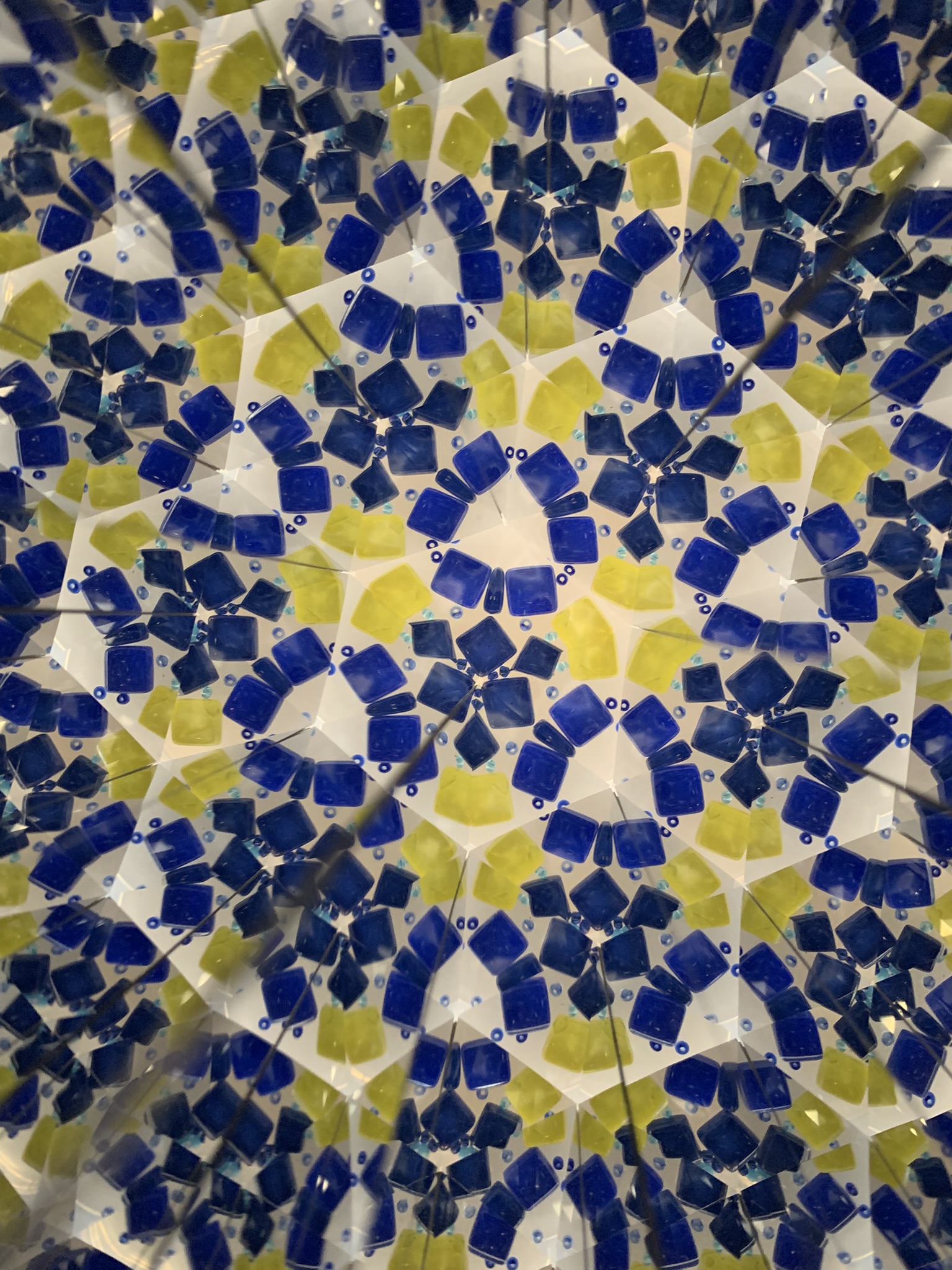 覗いてみると、他にはないしっかりした正方形を基本にした光映像が現れます。透明度の高い黄色や紺色、そして暗めの紺色の作り出す形は、花を上から見たような、驚くほど見事な対称性の世界となって表現されるのです。作者も、花のような形になるようにバランスを考えたとおっしゃっています。そしてこれが毎回、形を変えていくのですから見事としか言いようのない体験をさせてくれます。このように独創的な万華鏡を高く評価して審査員特別賞としました。