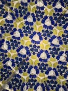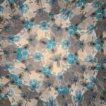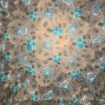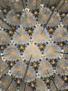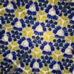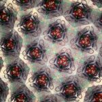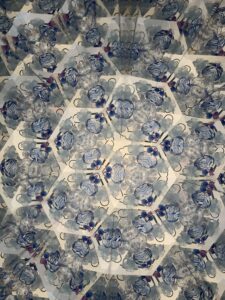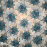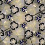 この白色を背景に、淡い青色や透明感の高い空色、花の色は紺色が配色されています。リボンや花などのオブジェクトを青色系統でまとめ、主調色(基調色)が青系統のさわやかな洗練された万華鏡となっています。美しい統一感と言えるでしょう。