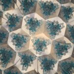 一つの波紋の中心に紺色の六角形のオブジェクトとそれよりも小さな紺色のオブジェクトが2個はられている波紋があります。そこには、白色の紐に水色の糸が巻きつけられて、円の形になった波紋があります。うねって光った水面の感じが一層伝わってきます。